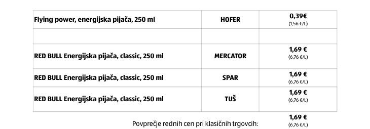 Povprečna cena Red Bulla velja na podlagi popisa cen v trgovinah Hipermarket Mercator (Cesta talcev 4, 1230 Domžale), Hipermarket Spar (Virska cesta 21,1233 Dob) in Tuš supermarket (Mestni trg 1, 1230 Domžale), izvedenega dne 6. 10. 2025.