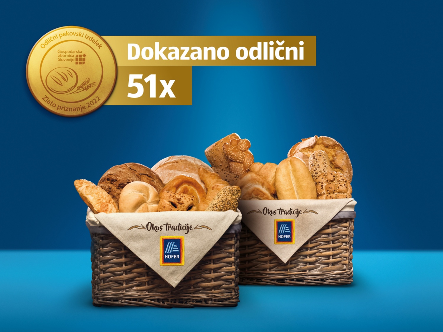 Zlata priznanja za odlično kakovost, ki jih že 22. leto podeljuje Zbornica kmetijskih in živilskih podjetij Gospodarske zbornice Slovenije, je letos v trgovinah HOFER prejelo kar 51 vrst pekovskih izdelkov HOFERjevih lastnih blagovnih znamk. Vonj po sveže pečenem kruhu, pecivu in drugih pekovskih dobrotah priznanih slovenskih dobaviteljev HOFERjeve kupce v vseh njihovih trgovinah pozdravlja že od leta 2015. Kruh in krušne dobrote se namreč večkrat dnevno pečejo kar v trgovini, s čimer kupcem zagotovijo vedno sveže in hrustljave izdelke.
