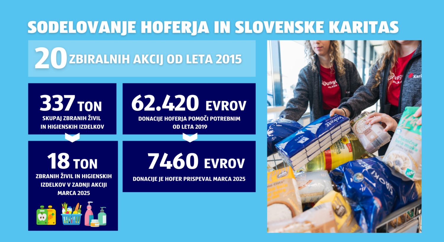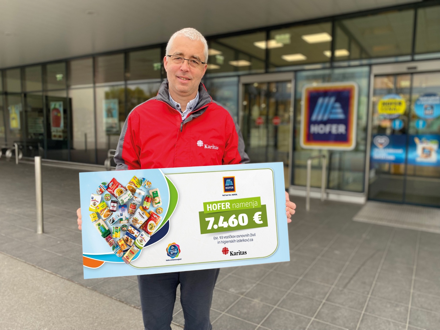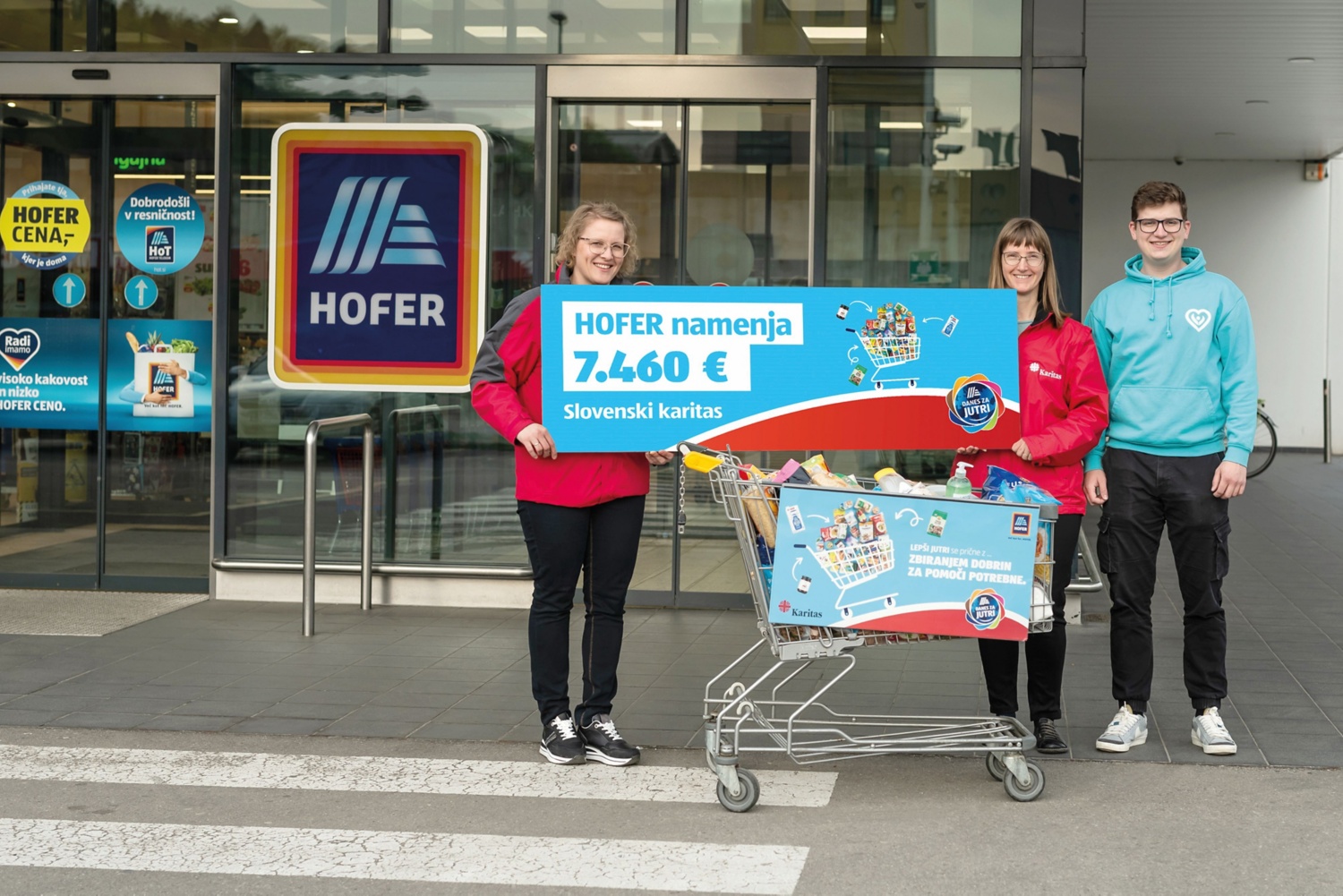 Pri HOFERju že od leta 2015 sodelujejo s Slovensko karitas, s katero tradicionalno prirejajo dve letni zbiralni akciji – v marcu in decembru. HOFERjevi kupci prispevajo osnovna živila, izdelke za otroke in higienske izdelke, ki jih Slovenska karitas razdeli pomoči potrebnim. V okviru dosedanjih 20 akcij so zbrali že 337,2 tone izdelkov. HOFER od leta 2019 zbranim izdelkom pristavi še dodatne nakupovalne vozičke z izdelki. Tokrat je podaril izdelke v skupni vrednosti 7460 evrov, medtem ko se je skupna številka donacij povzpela že na 62.420 evrov.