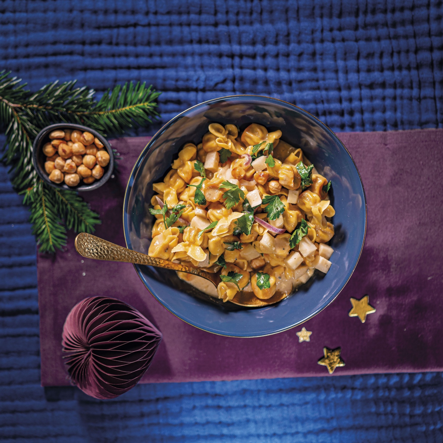 - Lešnike popražimo v ponvi brez maščobe, testenine pa skuhamo po navodilih na embalaži. Odcejene testenine, čebulo in gorgonzolo vmešamo v omako ter pustimo počivati 10 minut. Občasno premešamo, na koncu pa dodamo še hruške in lešnike.