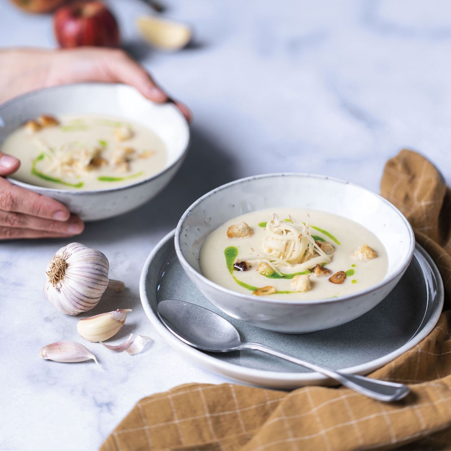 Juha iz jabolk in zelene s česnovimi krušnimi kockami