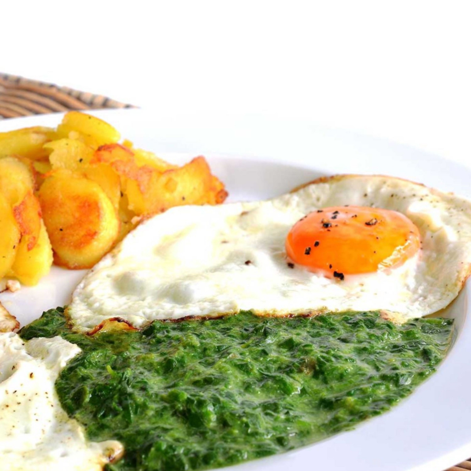 - V vročem loncu stopimo maslo, da se speni. Na njem prepražimo narezano čebulo in krompir. Dodamo listnato špinačo in segrevamo, dokler se ne odtali. Vmes večkrat premešamo in po potrebi dolijemo malo vode ali jušne osnove. Zalijemo s smetano, solimo, popramo in začinimo z muškatnim oreščkom. V ponvi spečemo jajca na oko. Krompir, špinačo in pečena jajca razporedimo na krožnike in okrasimo s sesekljanim majaronom.